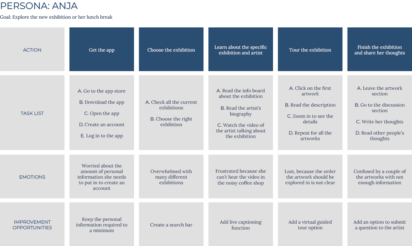 After identifying user problems, I created user personas and journey maps. Mapping Anja’s journey revealed what functions in the tour app would be very important for the user.
